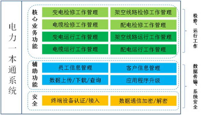 系統(tǒng)主要由終端設備管理,數(shù)據(jù)傳輸,檢修業(yè)務實施管理,運行業(yè)務實施管理以及安全防護管理等業(yè)務構(gòu)成。